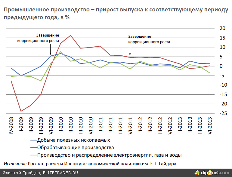Высокие темпы прироста выпуска промышленности (выше 5% в годовом выражении) наблюдались исключительно в период коррекционного роста российской экономики. В середине 2011 г. промышленное производство вышло на предкризисные объемы выпуска, началась следующая фаза развития промышленности, которая сейчас характеризуется затуханием роста. В первоначальной ее стадии (осень и зима 2011–2012 гг.) прирост выпуска составлял порядка 4% в годовом выражении, далее вплоть до осени 2012 г. он находился на уровне 2,5%, а с сентября 2012 г. темпы прироста снижались. На протяжении всего 2013 г. рост выпуска российской промышленности отсутствовал или находился на минимальном уровне.