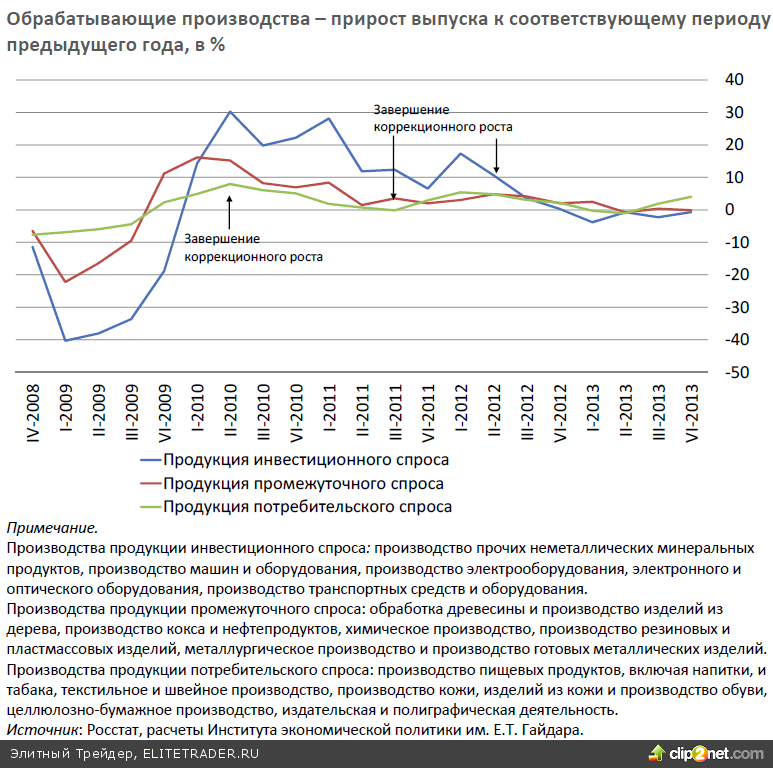 Производство продукции потребительского спроса восстановилось до предкризисного уровня уже во втором квартале 2010 г. В этот период (второй? третий кварталы 2010 г.) рост выпуска этих производств был максимально активным (порядка 7% в годовом выражении). Далее на протяжении двух лет здесь наблюдался нестабильный рост со средними темпами порядка 3%. Максимальный объем выпуска производств потребительского спроса относительно предкризисного уровня наблюдался во втором квартале 2012 г., после чего рост затормозился до минимальных значений в первом?третьем кварталах 2013 г. Важно отметить, что в четвертом квартале 2013 г. был зафиксирован неожиданно высокий рост выпуска этих производств (+4,0% в годовом выражении), но его стабильность как тренда неочевидна. Выпуск продукции промежуточного спроса вышел на предкризисный уровень в третьем квартале 2011 г. При этом и завершение коррекционного роста, и начало новой фазы роста (второй квартал 2011 – первый квартал 2012 гг.) характеризовались динамикой порядка 2,5% в годовом выражении. В дальнейшем, во втором?третьем кварталах 2012 г., рост производств промежуточного спроса ускорился до 4,5%, однако на протяжении последних пяти кварталов здесь отмечалось торможение выпуска до минимальных значений.