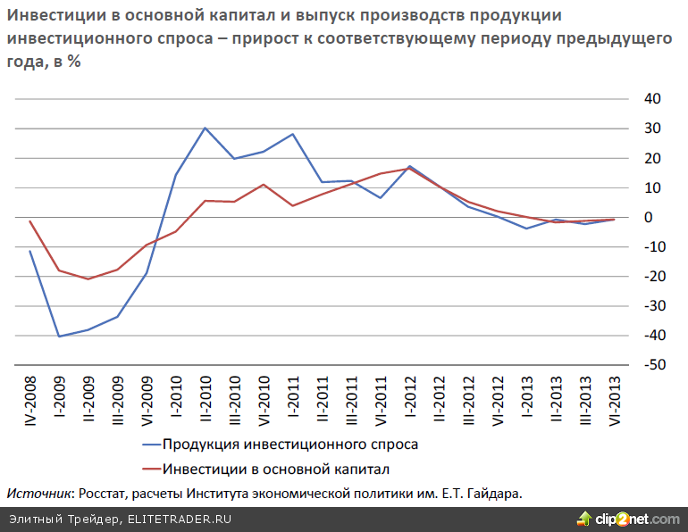 В 2013 г. рост промышленного производства практически прекратился; его объем превысил уровень 2012 г. на статистически минимальные 0,3%. Одновременно в 2013 г. в российской экономике наблюдалось торможение инвестиционной активности: объем инвестиций в основной капитал оказался ниже показателя 2012 г. на 0,3%.