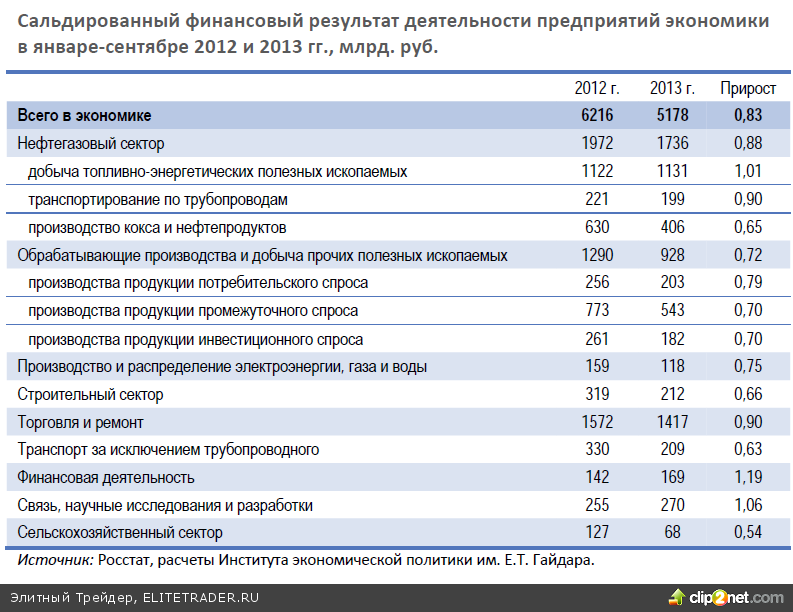Структурно в 2013 г. более трети прибыли экономики России формировалось в нефтегазовом секторе (31,7% в январе–сентябре 2012 г.). Несколько меньшая доля прибыли аккумулировалась в секторе торговли и ремонта (27,4%). В сумме на эти два сектора в 2013 г. пришлось почти 61% всей заработанной предприятиями экономики прибыли, и эта доля заметно увеличилась по сравнению с 2012 г. (57% в январе–сентябре 2012 г.). Государственная политика сдерживания инфляции и рост затрат определили сокращение доли транспорта, производства и распределения электроэнергии, газа и горячей воды, предоставления прочих коммунальных, социальных и персональных услуг: если в январе?сентябре 2012 г. она составляла 8,2%, то в аналогичном периоде 2013 г. – 6,6%. Кроме того, в структуре финансового результата заметно снизилась доля обрабатывающих производств (менее 18% в январе–сентябре 2013 г. против 20,8% годом ранее).