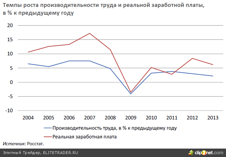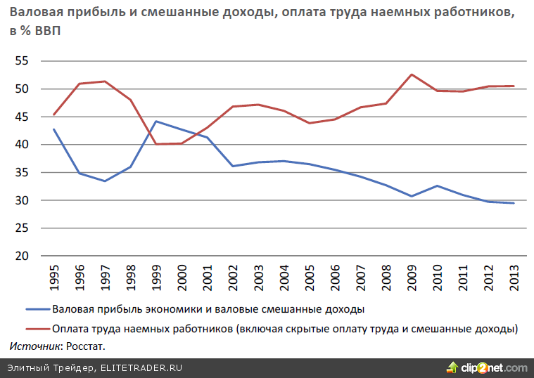 Существенное ухудшение финансовой ситуации в большинстве видов экономической деятельности и прогрессирующий дисбаланс структуры финансового результата в экономике в целом определяют ослабление внутреннего потенциала предприятий экономики для продолжения/начала реализации инвестиционных проектов, а также несут в себе риски более активного повышения цен при оживлении спроса в российской экономике. Снижение финансового результата в экономике в истекшем году было во многом обусловлено ростом издержек. Одной из характерных особенностей экономики РФ в последнее десятилетие являлось устойчивое опережение темпов роста реальной заработной платы над производительностью труда. Подобное положение имело причинами ряд факторов, в том числе перегрев рынка труда (дефицит рабочей силы средней и высокой квалификации), последствия «голландской болезни» (увеличение экспортных доходов от повышения цен на углеводороды), низкий уровень инноваций и проч. В результате в структуре ВВП при относительно постоянном уровне чистых налогов на производство и импорт последовательно увеличивалась доля оплаты труда наемных работников и, соответственно, снижалась доля валовой прибыли.