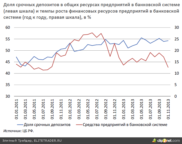 Снижение финансового результата в экономике определило динамику остатков счетов и депозитов предприятий в банковской системе. Одновременно увеличивалась доля срочных депозитов в общих финансовых ресурсах предприятий, что указывает на снижающуюся экономическую активность (поскольку деньги выводятся из оборота).