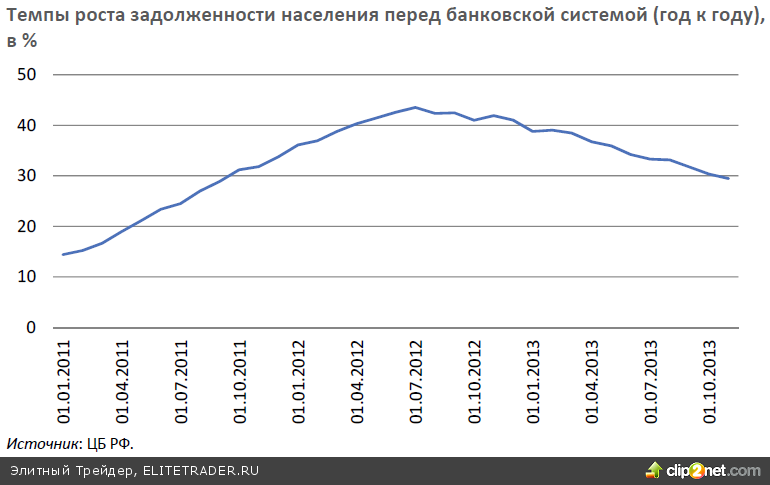 Расходы на конечное потребление домашних хозяйств составили в 2013 г. около половины ВВП. Тенденция снижения темпов роста объема розничного товарооборота прослеживается с начала 2012 г.: если в 2011 г. рост товарооборота составил 7.1%, в 2012 г. – 6.3%, то в 2013 г. – около 4%. Соответственно, чистое потребление увеличилось в истекшем году лишь на 2%. Снижение темпов роста розничного товарооборота было обусловлено как ослаблением роста располагаемых доходов населения, так и розничного кредитования. На приводимом здесь рисунке отчетливо видны периоды, когда потребление в заметной степени стимулировалось банковским кредитованием. Сегодня же объем накопленной задолженности по кредитам населения превышает 10 трлн. руб., а снижающиеся темпы роста задолженности уже в меньшей степени стимулируют потребление и в большей направляются на рефинансирование прежней задолженности