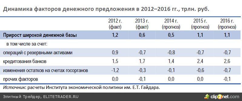 Начиная с 2011 г. основным фактором формирования предложения денег в российской экономике стало рефинансирование банковского сектора со стороны Банка России. Масштаб роста задолженности коммерческих банков перед регулятором сегодня значительно превышает увеличение денежной базы в широком определении (индикатор динамики денежного предложения) из?за большого оттока ликвидности по другим каналам, в первую очередь за счет стерилизации средств на счетах расширенного правительства в Банке России. Так, за 2011–2013 гг. объем денежной базы в широком определении увеличился на 2,3 трлн. руб., рефинансирование банковского сектора возросло на 4,1 трлн. руб., на бюджетные счета в Банке России поступило 3,2 трлн. руб. и операции с резервными активами обеспечили рублевую эмиссию в размере 0,6 трлн. руб. (и еще 0.8 трлн. руб. – за счет кредитов ЦБ РФ Агентству по страхованию вкладов, снижения остатков на счетах организаций в ЦБ РФ и прочих факторов).