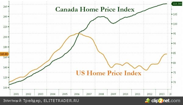 Вот так выглядит динамика индекса сектора жилья Канады в сравнении с аналогичным показателем США: