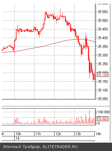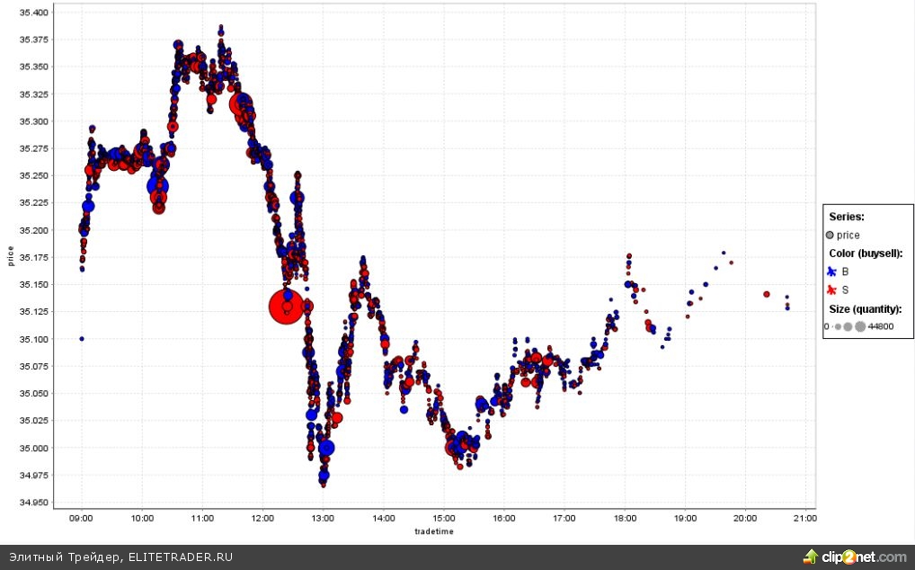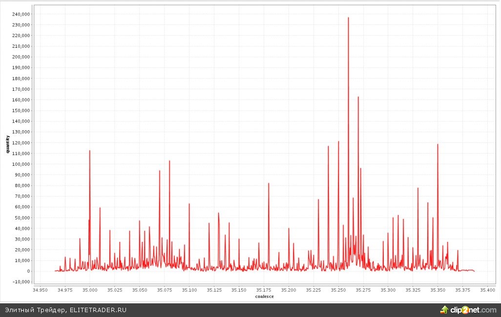Самый большой точечный объем в паре доллар-рубль сегодня прошел по цене 35,13 руб.: