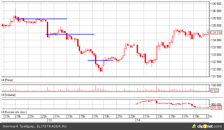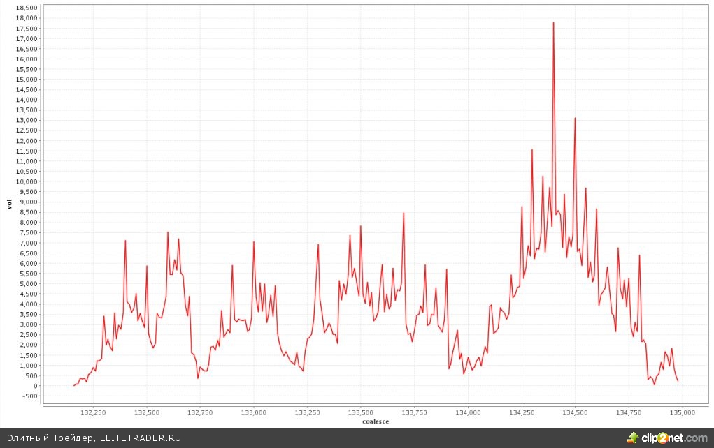 Синие линии — это некоторый краткосрочный баланс. Здесь была активность крупных игроков (ее можно мониторить не только лотами выше 1000 контрактов, но и более мелкой активностью внутри интервала времени). Как видим, в первой половине дня мы потестировали вчерашнюю зону активности, которая наблюдалась после открытия Америки, речь про 132 600 пунктов. Далее пришли туда, где я планировал следующую точку равновесия — 134 300 пунктов.