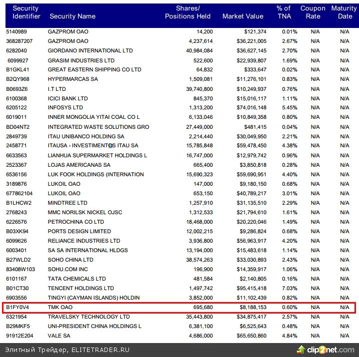 Марк Мобиус наконец-то выскочил из ТНК-BP. Ура! На кого в политических кругах ему пришлось выйти, чтобы организовать обратный выкуп акций Роснефть Холдинга даже страшно представить. Покопался сегодня на сайте его фонда Templeton BRIC Fund и увидел, что бенчмарку он чаще проигрывал, чем выигрывал. Единственное, хотелось бы обратить ваше внимание на то, что фонд делает более крупную ставку на ай-ти индустрию (ее больше всего в фонде) и на Китай. Может, кому из неспешных среднесрочных инвесторов пригодится. Из российских фишек выделю его инвестиции в СТС Медиа и ТМК, из голубых фишек — Лукойл, Газпром и ГМК Норильский никель.