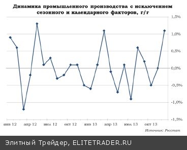 Компании-респонденты представили уточненные оценки объема промпроизводства за прошлый год. Статистическая служба не успела внести необходимые правки в помесячную динамику, что вызвало переполох. К ноябрю прирост выпуска составил целые 4,3%, а к среднемесячному значению предыдущего года с исключением сезонного и календарного факторов – аж 8,4%! К декабрю прошлого года – объем промпроизводства оказался выше на 0,8%, а за весь минувший год – на 0,3%. Неожиданный поворот позволил реализоваться чаяниям главы Минпромторга Дениса Мантурова и главы МЭР Алексея Улюкаева, которые предрекали сохранение показателей прошлого года.