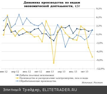 По данным Росстата декабрьский всплеск стал следствием увеличения добычи полезных ископаемых (+1,5% г/г) и роста загруженности обрабатывающих производств – впервые с апреля, прирост год к году стал положительным и составил 1,6%. Относительно теплый декабрь привел к уменьшению выпуска в сфере производства и распределения электроэнергии, газа и воды на 7,9%. В итоге за год в сфере добычи полезных ископаемых выпуск увеличился на 1,2%, в обрабатывающей промышленности – на 0,1%, в коммунальной сфере – напротив, уменьшился на 3,5%.