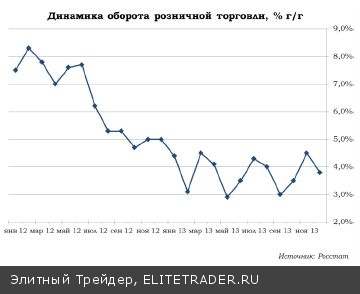 Данные вызвали удивление – средняя рыночная оценка говорила о росте на 0,2% г/г. Индексы предпринимательской уверенности, рассчитываемые Росстатом, зафиксировали ухудшение настроений в обрабатывающих производствах с -5 до -8%. В других сферах баланс оценок Росстата остался неизменным на отрицательной территории. Схожую картину можно было обнаружить и в отчете банка HSBC. Производственный индекс в декабре опустился до минимальных за четыре года отметок, составив 48,8 п. По компонентам ничто не предвещало оживление ситуации: количество невыполненных заказов оказалось на минимуме с июня 2011 года, активного поступления новых заказов не произошло, а склады готовой продукции опустошались слабыми темпами. Опросы, проведенные ИЭП им. Гайдара, не давали поводов ожидать в конце года «прорыва». Данные ЦМАКП также не говорили о выходе промышленности из стагнации. В итоге после столь «ударной» концовки 2013 года в I квартале 2014 года можно ожидать «расплаты» в виде как минимум околонулевых темпов роста.