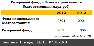 Благодаря меньшему, чем было предусмотрено ФЗ, дефициту, Резервный фонд по итогам 2013 года все же удастся пополнить на 207,6 млрд руб. (Для сравнения: за 2012 год в фонд поступили 713 млрд руб.). Ранее из-за невыполнения прогнозов по приватизации и не столь успешному, как в конце года, исполнению доходной части высказывалась идея направить средства фонда на покрытие дефицита, но не пришлось. За счет переоценки из-за курсовых разниц за год объем фонда увеличился на 261 млрд руб. В результате, как ожидается, его величина возрастет до 3 067 млрд руб. Переоценка средств из-за курсовых разниц пополнит и копилку Фонда национального благосостояния (ФНБ) ―на 216 млрд руб. Из-за действия бюджетного правила поступлений в ФНБ не предполагалось. В итоге по результатам года его объем суверенного фонда составил 2 901 млрд руб.