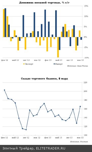 Согласно помесячной статистике Банка России, в ноябре положительное сальдо внешней торговли сложилось на уровне в $16,5 млрд (второй результат с начала года). Объем экспорта в годовом сопоставлении вырос на 3,2%, в то время как импорт сократился на 1,3%. В декабре профицит снизился до $14 млрд в результате сокращения экспорта на 1,8% г/г и роста импорта на 4,8% до максимума за год .