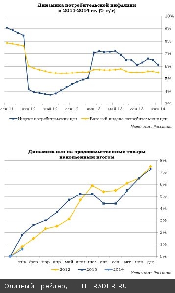 Банк России рассчитывает, что в 2014 году ему удастся удержать инфляцию на уровне в 5%, Минэкономразвития ждет от «коллег» большего — 4,8%. Мы же пока склонны занимать позицию скептиков, ожидая, что рост потребительских цен по итогам 2014 года составит 5,5%. Смягчение денежно-кредитной политики, на наш взгляд, произойдет только во втором полугодии. Сопроводительный комментарий к последнему заседанию совета директоров в декабре также указывал, что цели по инфляции будут выполнены во второй половине года.
