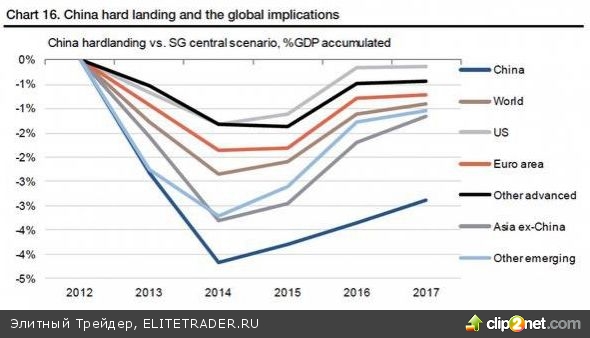 В такой ситуации темпы роста мирового ВВП уменьшатся на 1,5%. Спрос на сырьевые активы и машиностроительное оборудование резко сократится. В Societe Generale считают, что при таком развитии событий цены на нефть могут упасть на 30%. Наиболее сильно могут пострадать активы развивающихся стран. Подобный спад активности со стороны Китая ударит по валютам Бразилии, Индии, России, Южной Африки и многих других стран. На фоне бегства от риска и падения аппетита к активам развивающихся рынков процентные ставки по гособлигациям многих стран резко вырастут.