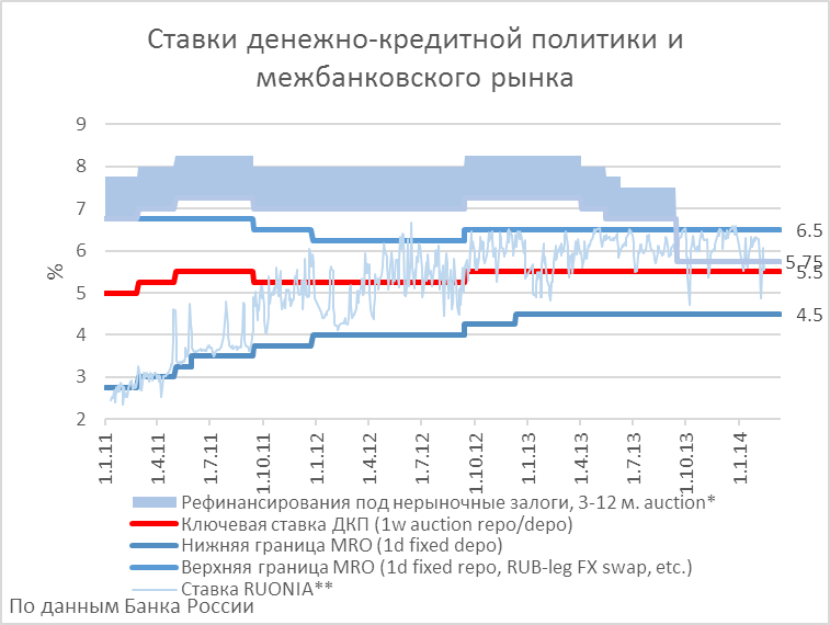 В отношении совокупного выпуска и занятости регулятор привычно уже констатировал их сохранение на уровне несколько ниже потенциального, попутно отметив, что текущая динамика кредитования не является фактором, сдерживающим экономический рост, а снижение деловой активности автоматически привело к определённому снижению кредитных ставок. Таким образом, с тех пор, как к осени 2012 ЦБ РФ закончил цикл ужесточения денежно-кредитной политики (выхода из сверхмягкой политики восстановительного периода после рецессии 2008-09 годов), на протяжение почти полутора лет ставки по основным рефинансовым операциям (MRO) остаются неизменными.