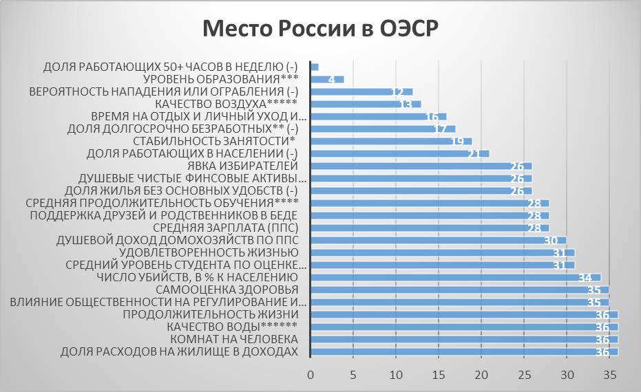 * Доля занятых на текущем рабочем месте менее 6 мес. (-) ** Более года *** Доля людей с образованием, по крайней мере, на уровне старших классов средней школы в возрасте 25-64 **** В возрасте 5-39 ***** В городах от 100 тыс. ****** Доля удовлетворенных по опросам ******* Для работающих фулл-тайм. Включая сон и еду.