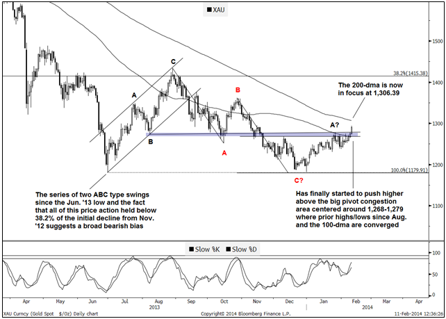 Эта область включает ряд предыдущих максимумов/минимумов с августа 2013 года, а также 100-дневное скользящее среднее (цены на золото). Это открыло риски для 200-дневного скользящего среднего на отметке в $1,306.39.