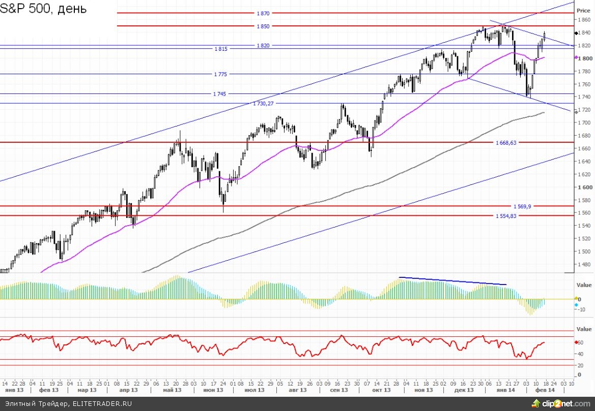 За океаном рынок акций практически полностью отыграл всю недавнюю коррекцию. Индекс широкого рынка SnP 500 снова вблизи своих исторических максимумов (1850) и вот-вот попытается их преодолеть. Сейчас с точки зрения техники необходим небольшой откат, чтобы снять накопленную перекупленность, однако затем движение наверх вероятно будет продолжено. В качестве следующего ориентира все также выделяю область 1870-1875.