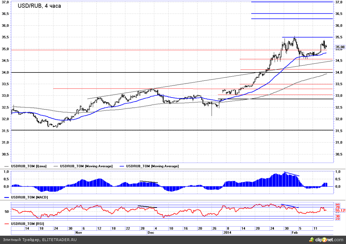 Что касается ближайших перспектив пары доллар/рубль, то, несмотря на технический потенциал роста вплоть до 36,5-37, текущая картина очень сильно начинает напоминать разворотную. Мощный откат в пятницу, который произошел после заседания нашего ЦБ, заставил пересмотреть взгляд на текущее положение дел. О цели роста пары usd/rub в район 36,5 забываем до тех пор, пока котировки либо не поднимутся выше 35,4, либо курс не откатится в район 34-34,1.