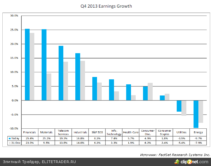 К настоящему моменту почти 80% компаний состава SnP500 отчитались о результатах 4 квартала, из них согласно данным FactSet 71% превысил оценки аналитиков по прибыли, что ниже среднего за последние четыре года составляющего 73%. В совокупности компании сообщили о прибыли на акцию на 3,3% выше, чем предполагал консенсус прогноз, что опять же ниже четырехлетнего среднего уровня 5,8%. Средний темп роста прибыли теперь составляет 8,3%, что выше чем показанные 8,1% неделей ранее. Выручка в 66% случаев оказалась лучше ожиданий, что заметно выше среднего последних четырех кварталов и четырех лет - уровней 54%-59%.