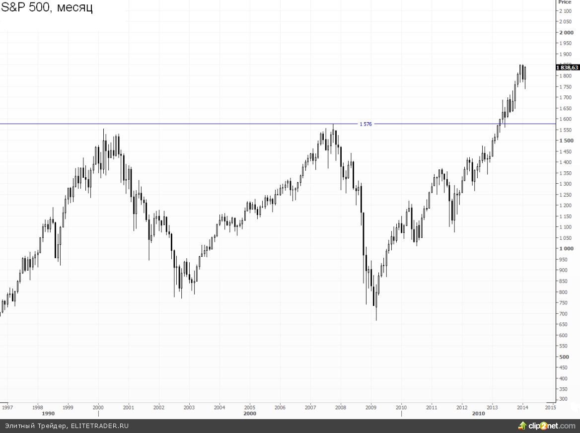 На мой взгляд, среднесрочная картина сейчас будет характеризоваться широкодиапазонной фазой дистрибуции, когда на каждом новом максимуме будет появляться огромное количество продавцов, преимущественно крупных. Многие фонды будут стремиться реализовать накопленные лонги с минимальным отклонением от текущих высот. Ни на какой прогрессивный рост до 2000 пунктов и выше не рассчитываю. Что-то подобное наблюдалась в 2000 и 2007 годах. Лучший сценарий, как уже было сказано выше, предполагает заскок за 1900. Период консолидации возле максимумов может затянуться на неопределенный срок, но в итоге нас неминуемо ждет коррекция минимум на 15%, то есть поход ниже 1600 в перспективе 1-2 лет неизбежен.
