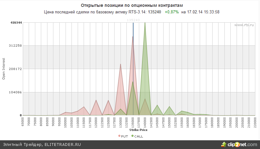 Между тем открытые опционные позиции по RIH4 со сроком исполнения 15.3.14 сейчас также смотрят в сторону роста. Большое количество открытых опционов пут открыто на отметке 135000 что говорит о сильном сопротивлении на данном уровне, а эквивалентное количество опционов колл располагается лишь вблизи 140000.