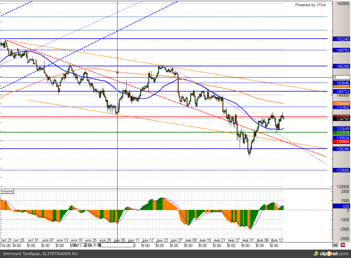 Таким образом, индикаторы настроений сейчас дают умеренно позитивный сигнал. Поэтому можно попробовать открыть длинные позиции в районе уровня 134000 с минимальным стопом или после преодоления сегодняшних максимумов на уровне 136100.