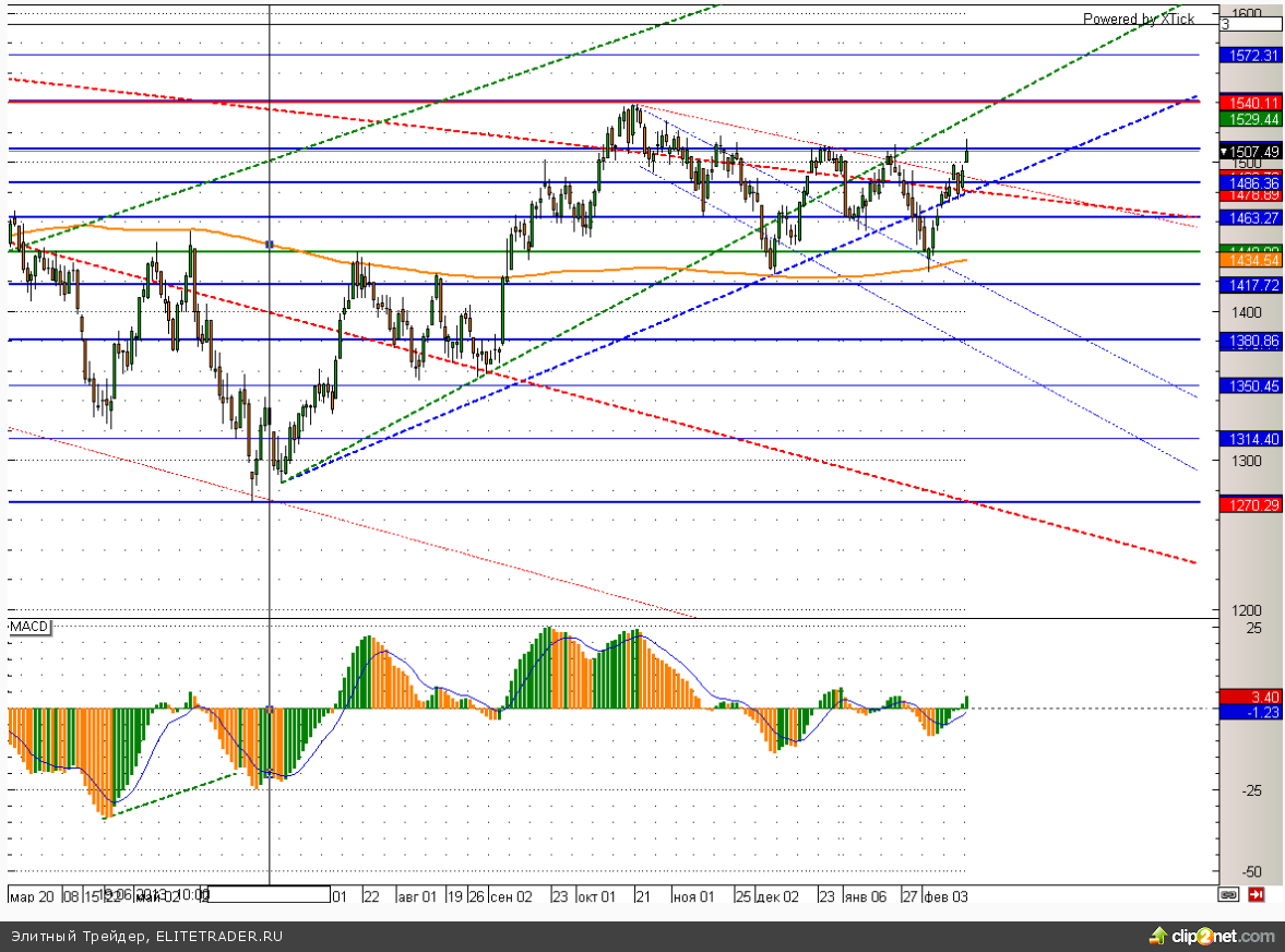 Российский рынок завершил торговую сессию понедельника на положительной территории. При этом ММВБ окончательно закрепился выше отметки 1490, где проходит нисходящая трендовая линия. Теперь на пути российского индекса встало серьезное сопротивление в виде отметки 1510. От того удастся ли его преодолеть, пожалуй и будет зависеть динамика последующих нескольких недель.