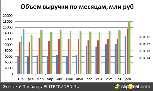 Такая динамика оборота в первый месяц года означает, что компания достаточно успешно борется с общими проблемами FMCG-ритейлеров, в числе которых снижение темпов роста инфляции (за январь 2014 года индекс потребительских цен составил 100,6% против 101% годом ране) и потребительской активности населения. Группа сумела нарастить выручку на 17,7% г/г за месяц, традиционно являющийся самым слабым по данному показателю у ритейлеров, и этот факт позволяет рассчитывать, что год будет для Дикси не таким уж неудачным, как ожидалось ранее. Напомню, что в январе 2013 выручка группы повысилась на 20,3% г/г, а за прошлый год в целом — на 22,7% г/г.