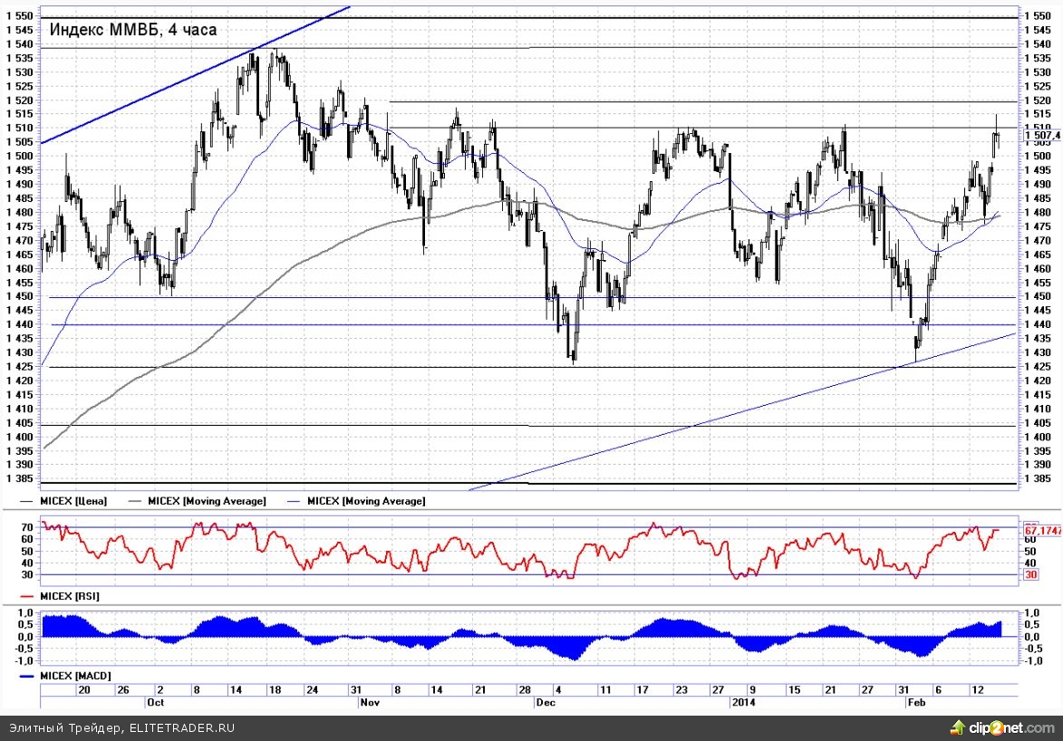 Фиксация спекулятивных длинных позиций в текущей ситуации выглядит оправданной, так как в сложившейся ситуации вероятность отката с точки зрения техники заметно выросла. Тем не менее все же склоняюсь к более позитивному сценарию. С коррекцией или без, но в краткосрочной перспективе, скорее всего, можно будет рассчитывать на преодоление ключевых сопротивлений по индексу ММВБ (1515) и дальнейшему движению наверх. При таком раскладе далее нас будет ждать самый важный уровень последних лет на 1550.