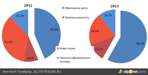 На мой взгляд, ни предложение, ни предъявляемый промышленностью спрос, объем которого практически не изменился (-0,7%), не являлись ключевыми факторами, определяющими конъюнктуру рынка драгоценного металла в прошлом году. Поддержку золоту оказало увеличение потребления в сфере ювелирного дела, а главный негатив исходил из инвестиционной сферы. Данные процессы внесли существенные коррективы в структуру спроса.