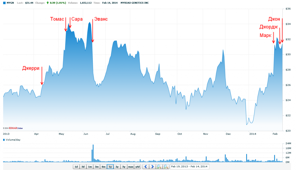 В почту пришло сообщение «Договорились». Ну, наконец-то, теперь дело за Vanguard Group. Это они обещали надавить на людей из Верховного Суда, где будет слушаться дело о праве собственности на патент на ген BRCA1. А дальше все просто: положение о “Доступной медицине” в рамках программы Obamacare будет требовать, чтобы все налогоплательщики заплатили за анализ на BRCA1, который будет делать только Myriad Genetics. Это увеличит стоимость фирмы раза в 2. А там уже можно и продаваться этим китам из Thermo (Thermo Fisher Scientific).