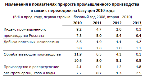 Такие эффекты «ретроспективного ускорения» связаны с тем, что в обновлённой базе больший вес получают более динамичные виды деятельности. Но поскольку на период между предыдущими сменами баз (2008-10) пришлась рецессия, то в данном случае влияние смены базового года оказалось малосущественным.