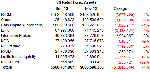 Данные CFTC, которые обновляются ежемесячно, показывают, что клиенты не переходят от одного брокера к другому, а просто закрывают свои валютные счета, поскольку объем клиентских средств на счетах практических всех американских форекс-брокеров продолжает уменьшаться. Понять суть процессов достаточно легко, если посмотреть на декабрьский отчет CFTC. Легко заметить, что объем активов большинства форекс-брокеров сократился на 1-4%.
