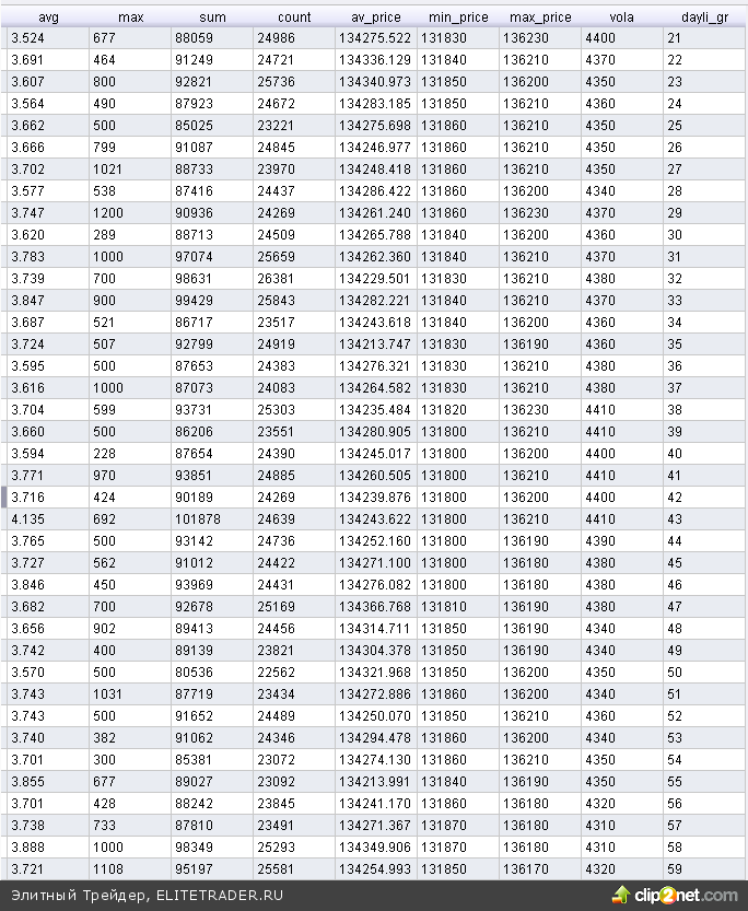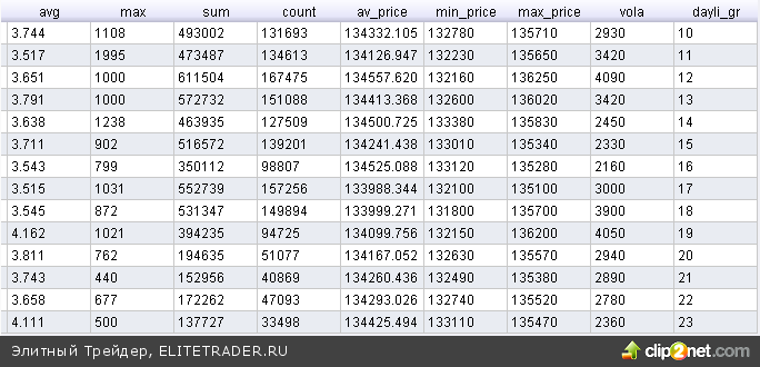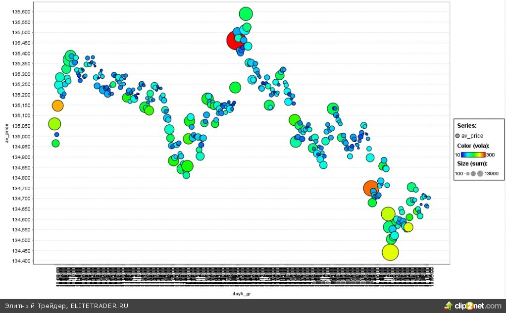 Также я построю агрегацию объемов торгов, цены, волатильности (максимальное отклонение между максимумом и минимумом, сложных моделей не будем использовать) в отношении сегодняшнего РИ: