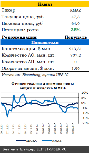 По нашим оценкам, что январское падение продаж было вызвано сочетанием сезонного фактора и резкого ослабления рубля, и в последующие месяцы продажи частично восстановятся. Падение рубля, напротив, поддержит продукцию КамАЗа против иностранных конкурентов. Тем не менее, спрос на грузовые автомобили выглядит слабее, чем даже спрос на легковые автомобили – из-за замедления экономики и завершения ряда инфраструктурных строек. Ситуация в отрасли выглядит тяжелой, и это будет продолжать оказывать давление на котировки КамАЗа. Долгосрочным поддерживающим фактором по-прежнему остается ожидание оферты от Daimler после получения контроля над активом, однако вероятность того, что это произойдет в ближайшее время, крайне незначительна.