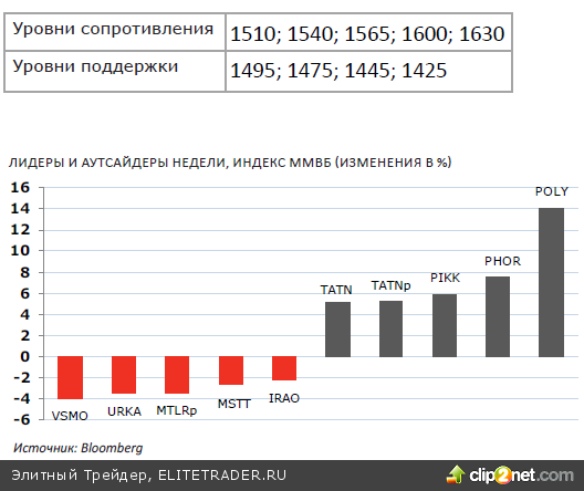 Индекс ММВБ провел прошлую неделю в боковом диапазоне. Попытки снижения в понедельник и в четверг останавливались в районе 1475 пунктов. Рост немного не доходил до полуторатысячной отметки и в среду, и в пятницу (1496,18, +1,2%), подтвердив правильность нашего прогноза