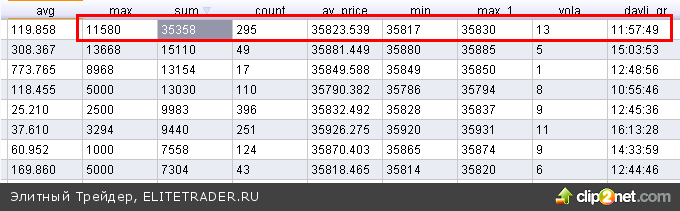 Во фьючерсе доллар-рубль сегодня была максимальная активность на микроуровне в 11:57:49. В диапазоне между 35 817 и 35 830 пунктов за секунду проскочили 35 538 контрактов за 295 сделок. Здесь же 1 сделка прошла 1 лотом на 11 538 контрактов. Другая точечная активность была по 35 885 пунктов 1 тиком сразу 13 668 контрактов, но внутри секунды наторговали немного для микроуровня — всего 49 сделок внутри данной единицы агрегации временного ряда.Одним словом, объемные активности сегодня легли плотно между 35 817 и 35 830 пунктами: