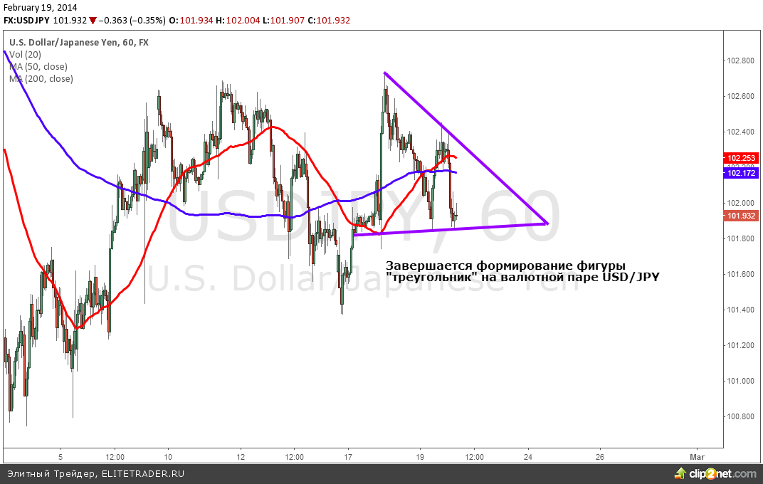 Сегодня утром опубликовали расчеты по индексу цен производителей в Новой Зеландии показал снижение на 0.7% при прогнозе увеличения на 0.9%. Также произошла публикация цифр от банка HSBC по индексу деловой активности в производственном секторе Китая. Реальное значение по сравнению с прогнозами аналитиков оказалось гораздо хуже и составило 48.3 пункта против предполагаемого значения 49.4 пункта. Сразу после публикации азиатские фондовые площадки и валютная пара USD/JPY показали снижение. На часовом графике пары видно, что завершается формирование технической фигуры “треугольник”.