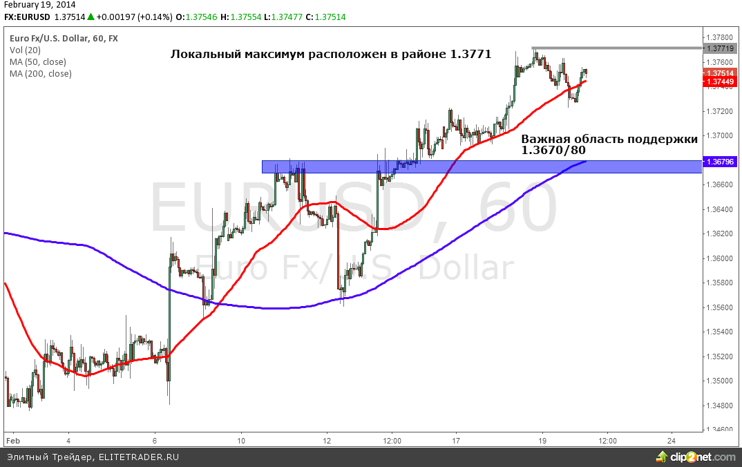 Также не порадовали инвесторов и отчеты из США. Темпы американское промпроизводства имеет тенденцию к замедлению. Расчеты ранее опрошенных аналитиков совпали с реальными цифрами и показали рост на 0.2%. Число выданных разрешений на строительство новых домов составило 0.94 млн при консенсус прогнозе 0.98 млн домов. Также были опубликованы протоколы ФРС США, в которых было отмечены успехи экономики в конце прошлого года, хотя некоторые из участников заседания выступили за приостановку автоматического сокращения программы количественного смягчения QE 3. На этом фоне трейдеры стали продавать доллар США и пара EUR/USD вновь устремилась к локальному максимуму, расположенному на уровне 1.3771. Важная область поддержки находится в области 1.3670/80 (200 часовая скользящая средняя).