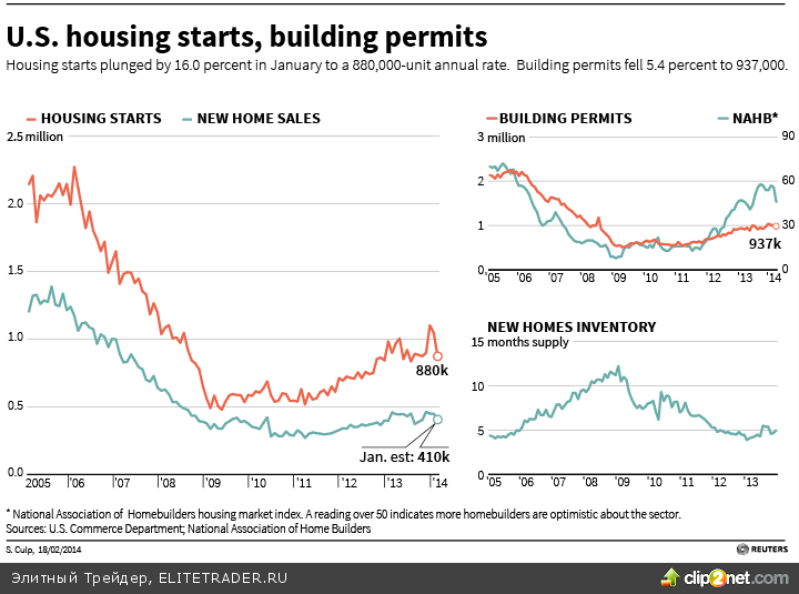 Данные по количеству новостроек в январе указали на самый серьезный спад почти за три года до самого низкого уровня с сентября. Новых домов оказалось 880 тыс., против пересмотренных декабрьских 1048 тыс. и прогнозных 950 тыс. Количество выданных разрешений на строительство составило 937 тыс., против прогнозных 980 тыс.