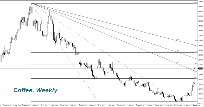 Помимо дорожающих пшеницы (Wheat) и сои (Soyb), следует отметить мощнейший рост цен на кофе (Coffee). Его цена за три недели поднялась почти на 40% и достигла годового максимума благодаря опасениям сокращения урожая из-за плохой погоды в Южной Америке. По пессимистическому сценарию, производство кофе в Бразилии в этом году может сократиться на 30%. Точную цифру назвать сложно до начала сбора урожая в мае. Аналогичная ситуация наблюдается с бразильской соей. Фермеры не могут сказать каким будет объём производства в нынешнем году. Сейчас урожай сои в Бразилии оценивается в 85-92 млн. тонн. Сельскохозяйственные агентства регулярно сообщают свои уточнённые прогнозы. Это вызывает колебания котировок сои в рамках восходящего тренда. Отметим также рост котировок кукурузы (Corn).