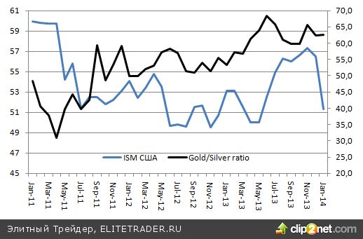 Главным драйвером роста для серебра является напряженная ситуация на рынках развивающихся стран, обусловленная процессом оттока капитала из-за сворачивания американского QE и рисками замедления роста ВВП в Китае. Девальвация валют EM способствует повышению спроса на драгоценные металлы, которые используются в качестве важного инструмента диверсификации инвестиционных портфелей. При этом серебро чувствует себя лучше золота, котировки которого в феврале выросли лишь на 5,9%, что полностью вписывается в концепцию корреляции PMI от ISM и коэффициента gold/silver.
