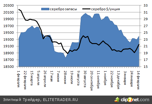 Запасы серебряных биржевых фондов демонстрируют смешанную динамику: сокращение на 211 тонн за первые три недели января сменилось ростом на 122,6 тонны за пятидневку к 24 января. Впоследствии показатель медленно снижался, чтобы вырасти до +104,2 тонны за неделю к 14 февраля. Можно ли это назвать стабилизацией запасов по аналогии с золотыми ETF? Сомневаюсь.