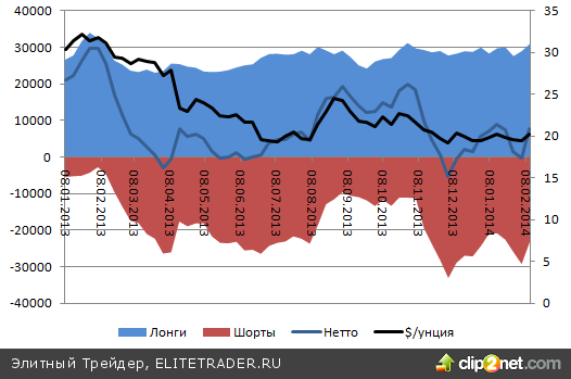 Несмотря на благоприятный внешний фон в виде разочаровывающих данных по экономике США, дающих пусть и слабую надежду на приостановку процесса сворачивания QE, резкий взлет котировок был обусловлен действиями хедж-фондов. В предыдущем материале я обратил внимание на несоответствие динамики цен изменениям нетто-позиций по деривативам и попытался объяснить это процессом накопления лонгов крупными институциональными инвесторами. Взрыв, произошедший 14 февраля, ознаменовал выход котировок из диапазона консолидации. Их дневной прирост составил 4,9% и стал максимальным за последние пять месяцев. Неудивительно, что за две недели к 11 февраля хедж-фонды нарастили лонги почти на 11,8%, проявив наибольшую активность с октября.