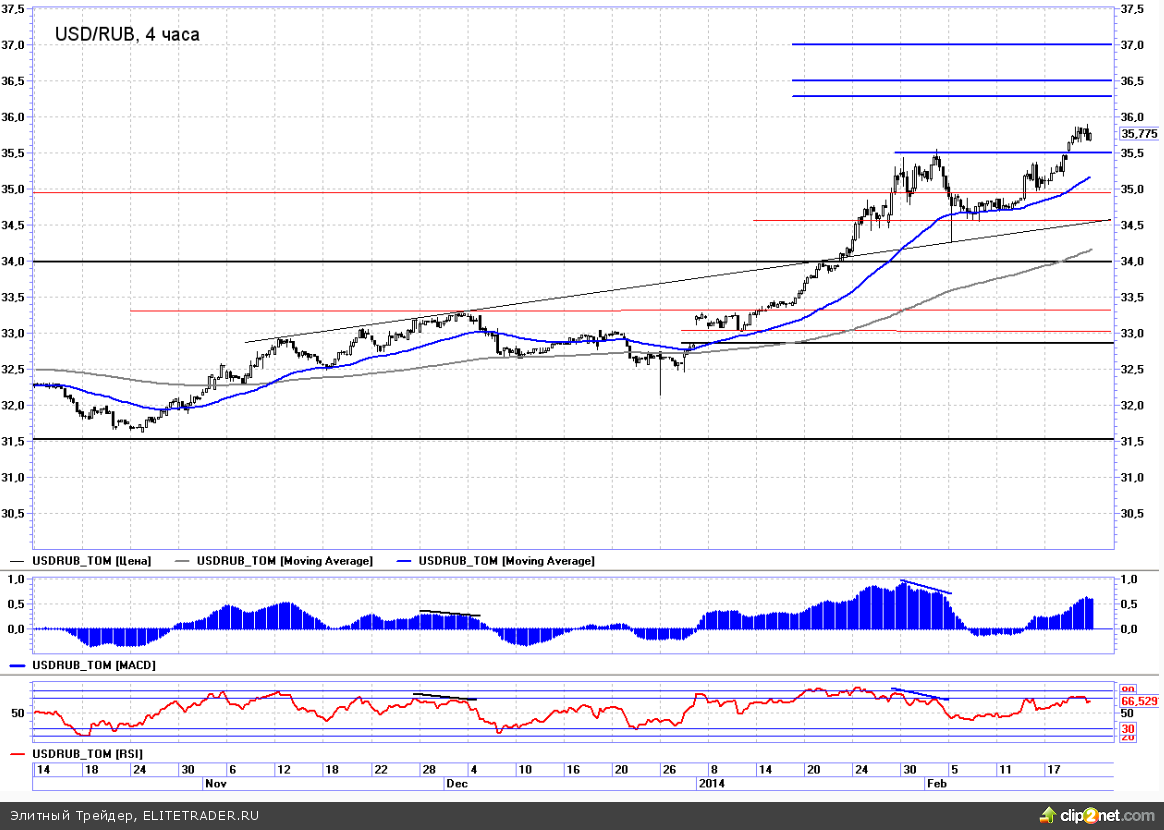 Что касается ситуации на валютном рынке, который в последнее время заинтересовал трейдеров гораздо больше, чем рынок акций, то здесь наблюдается локальная фаза консолидации в рамках диапазона 35,65-35,9. Ситуация следующая: в случае пробоя верхней границы (35,9), восходящая динамика в паре usd/rub продолжится и мы будем ориентироваться на старые среднесрочные цели в районе 36,5-37.