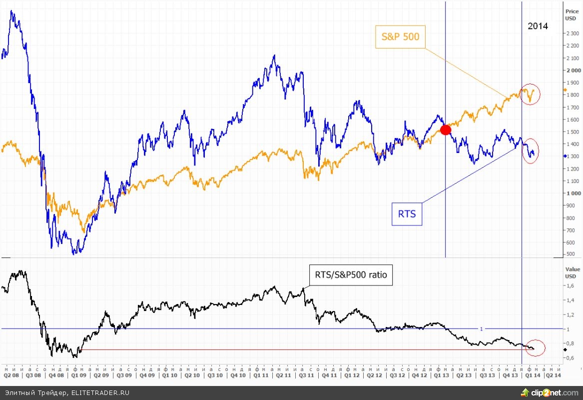 Стоит отметить, что отставание российского рынка от площадок развитых стран, к сожалению, продолжается. Соотношение нашего долларового РТС и SnP500 вчера снова обновило минимумы с 2009 года.