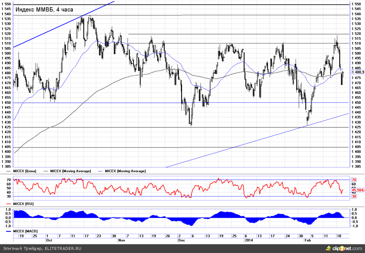 Так и не сумев закрепиться в начале недели над верхней границей боковика 1425-1510, индекс ММВБ впоследствии вновь вернулся в его рамки, соответственно реализуя новую волну снижения в нем. Вчера индекс достиг уже середины боковика, то есть поддержки на 1470, но ее уверенного пробоя не последовало.