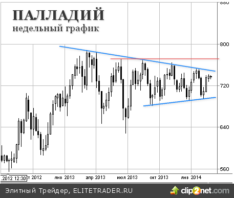 Один из фаворитов всего рынка commodities на текущий год – палладий – уже больше года торгуется в сужающемся канале вокруг зоны $700-750 за унцию. Вполне возможно, что в ближайшее время канал будет расширен, хотя предпосылок для сильного трендового движения пока не заметно.